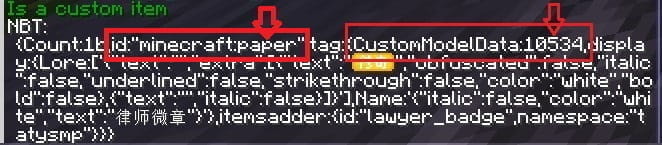 我们看到他的 ID 是 minecraft:paper,以及 CustomModelData(简称CMD) 值是 10534