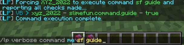 /lp verbose command <me|player> <command>例如,在下方截图中让我(“me”)执行“sf guide”命令并打印权限检查。